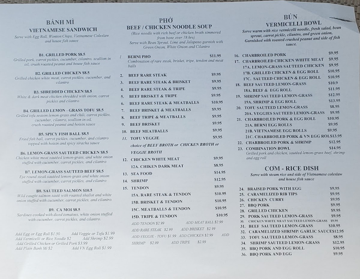 The culinary offerings at Berni are nothing short of amazing. Dive into a bowl of their Seafood Pho, which bursts with rich flavors and generous portions of fresh seafood—just as one satisfied customer, Harold, raved about. The broth is pack with nuanced flavors, ensuring that every sip unfolds a new layer of taste. Complementing their pho, the Pad Thai and Pad Woon Sen are also standouts, each crafted with care and featuring perfectly sourced ingredients like tofu, bean sprouts, and vibrant veggies. Each bite dances on your palate, evoking the essence of traditional Vietnamese cooking. Be sure to try the Banh Mi sandwiches—particularly the Grilled Pork or the Grilled Chicken, both of which come adorned with crunchy carrot pickles, fresh cucumber, and a touch of house fish sauce that elevates the dish into a symphony of flavors.